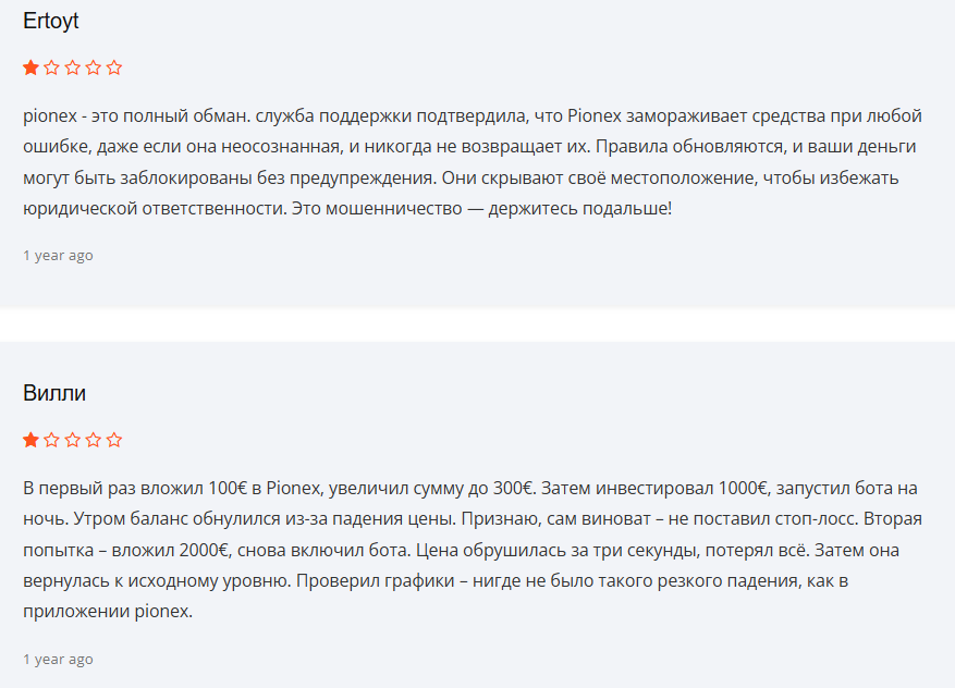На апрель 2026 года отзывы конкретно на Pionex Card в интернете не публикуются. Зато есть много упоминаний биржи, с которой связан продукт – в негативном ключе. Пользователи утверждают, что при работе здесь вероятны блокировки средств – на их возврат рассчитывать не приходится. Никакие предупреждения при этом не приходят.