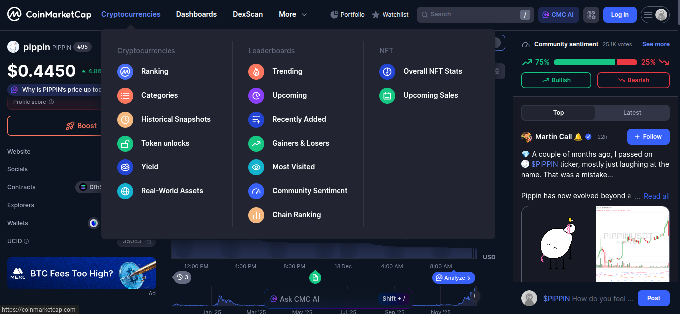 Для сбора дополнительной информации мы использовали профильный агрегатор цифровых монет CoinMarketCap. Итак, по темпам роста мемный проект без технической подоплеки находится на 95 месте. Ниже по центру расположен график курса криптовалюты и роста цены PIPIN. По данным на 18.12.2025 стоимость коина выросла на 0.99% за сутки и составляет 0.4351 доллара. Помимо движения прайса на скриншоте ниже можно увидеть параметры закупок и продаж криптовалюты.