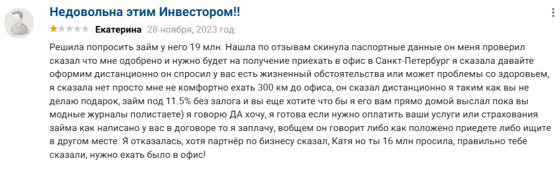 Мы не рекомендуем занимать деньги у Письменского Бориса Павловича, чтобы не появились проблемы. Вероятнее всего, вы потеряете финансы, так как «инвестор» берет плату за дополнительные услуги. Предлагаем вам прочитать наши подробные обзоры, в которых разбирается деятельность инвесторов и не только.