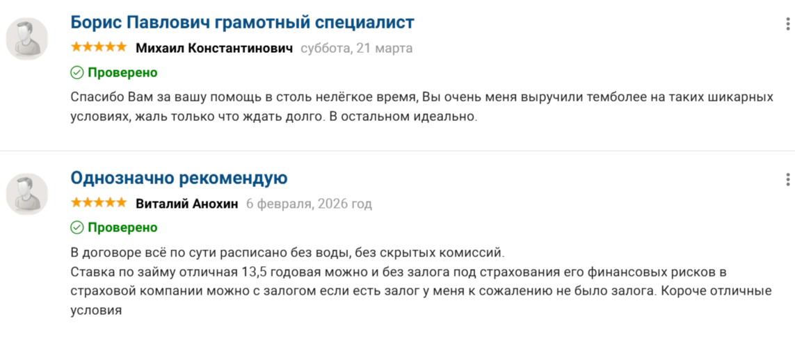 Отзывы об инвесторе Письменском Борисе Павловиче различные. Одни клиенты благодарят его за возможность решения финансовых проблем. Они отмечают, что предлагается выгодный процент и действуют лояльные условия. Другие клиенты недовольны работой инвестора. Есть жалобы на длительное ожидание и требование ехать в офис, так как нет онлайн-оформления.