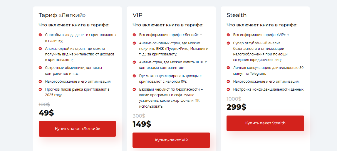 Автор exitplan cc предлагает несколько вариантов обучения. Базовый пакет «Легкий» стоит 49 долларов, пакет VIP — 149 долларов, а пакет Stealth — 299 долларов. В рамках каждого из них доступен разный набор обучающих материалов.