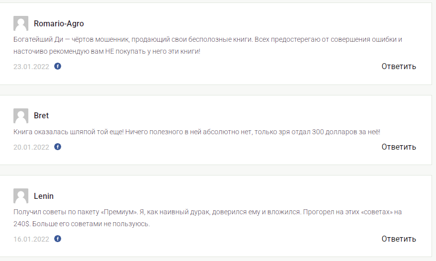 На странице проекта есть положительный отзывы якобы благодарных учеников. Но доверия они не заслуживают. На независимых ресурсах пользователи называют блоггера Богатейший Ди мошенником, а книгу – бесполезной.