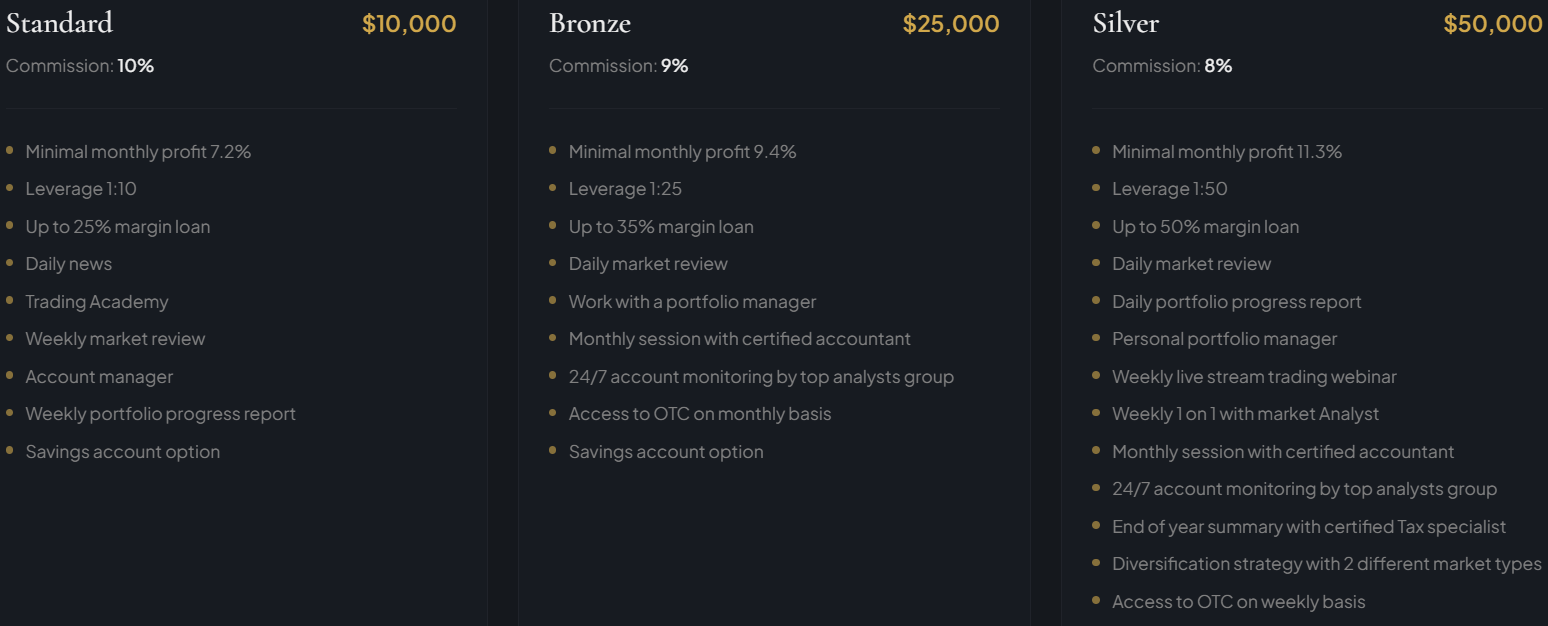 Минимальный депозит на Canfordcastle com составляет аж $10 000. За эти деньги клиент может рассчитывать на стандартный тарифный план с базовыми опциями. Для получения максимальных преимуществ придется внести от $500 000. Такие клиенты якобы получат доступ к начислению дивидендов, возможность посещать VIP-события и торговать без спредов и свопов.