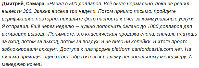 Брокер Canford Castle проработал недолго, но о нем уже вышли негативные отзывы. Клиенты подтверждают, что у них забирали деньги под предлогом заработка на торговле.