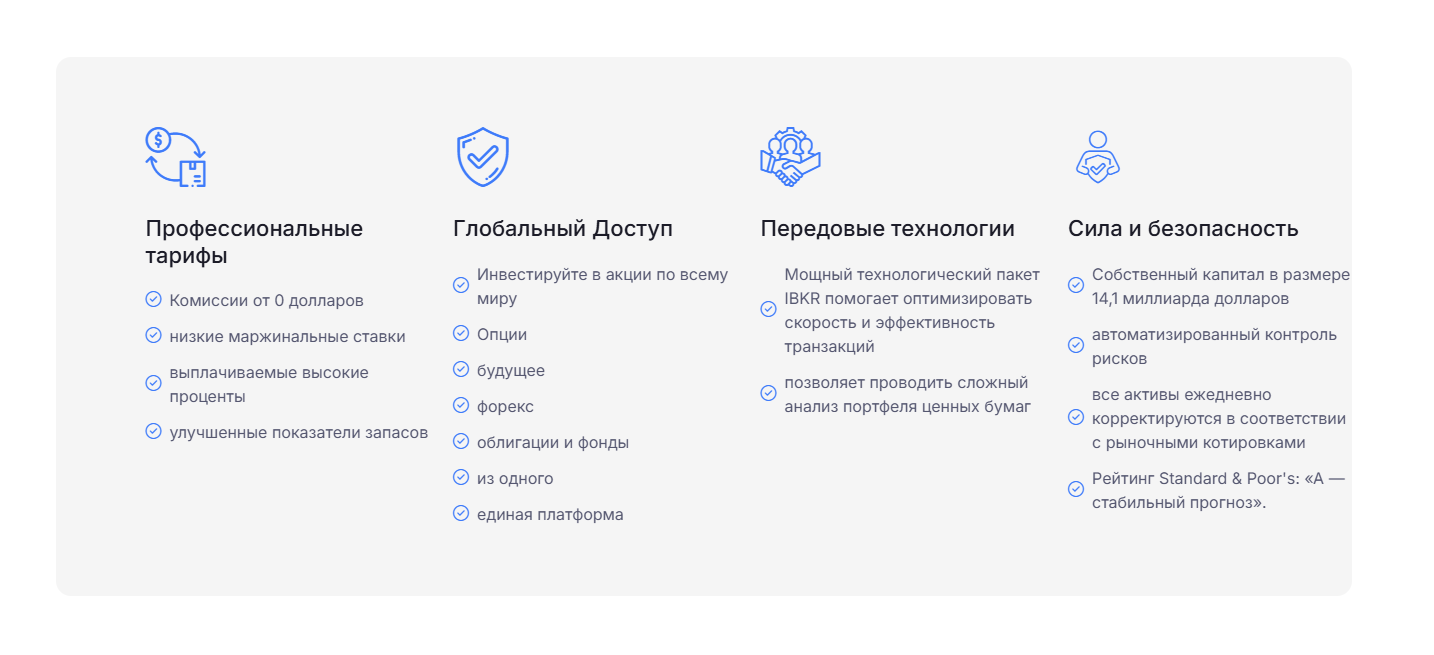 Еще ниже расположены преимущества сервиса. В качестве плюсов обозначены нулевые комиссии, возможность торговли фьючерсами, через спотовых ботов. Также для пользователей будет доступен технологический пакет IBKR, увеличивающий скорость транзакций, пополнения счета и вывода денег с баланса кошелька.