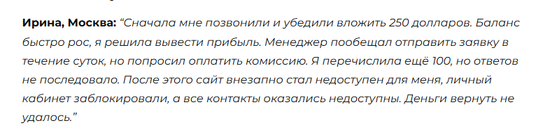 Другой инвестор в негативном отзыве тоже подтверждает слова о мошеннических платежных схемах основателей проекта. Автору комментария пообещали приумножение депозита, но в итоге забрали последние деньги, еще и обманом выманивали финансы.