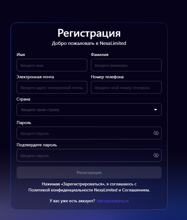 Для регистрации на сайте брокера NexaLimited необходимо ввести логин, имя, фамилию, название электронного ящика. Клиенту на почту придет ссылка, по которой он сможет активировать аккаунт. Верификация личности не требуется.