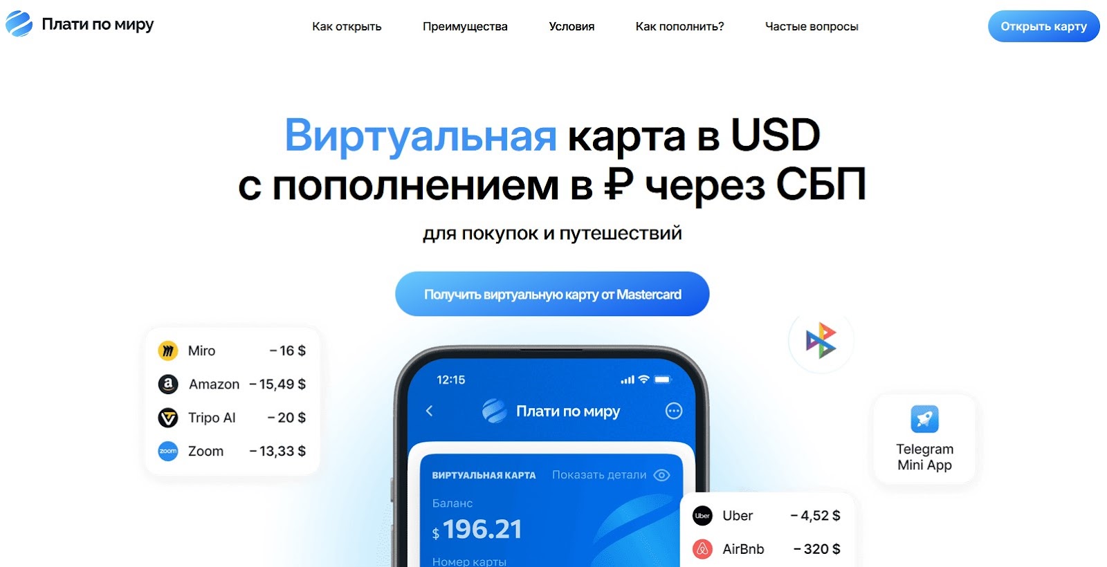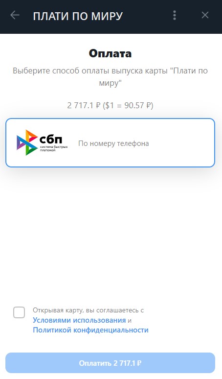 Процесс открытия карты максимально простой. На сайте нужно нажать кнопку «открыть карту», после чего пользователь переместится в Телеграмм, где в боте можно запустить приложение. В нем не требуется регистрироваться, достаточно выбрать карту и перевести на ее открытие $30 через Систему быстрых переводов.