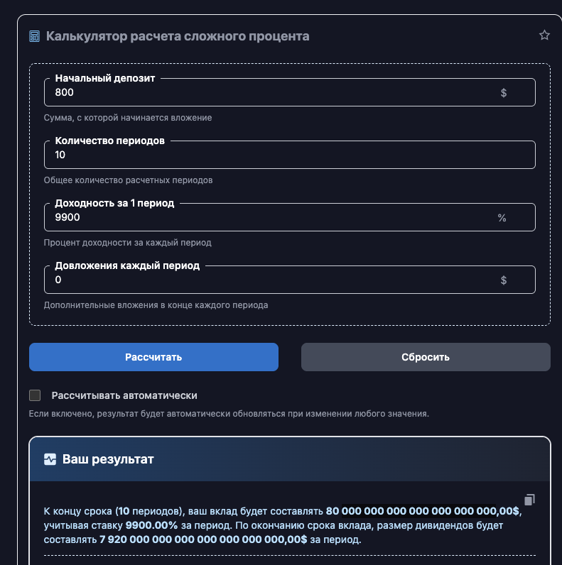 Даже если взять минимальный тариф и закинуть его доходность в калькулятор сложного процента, то можно увидеть, что всего за 10 дней автор якобы может сделать из 800 рублей – 80 секстиллионов рублей.