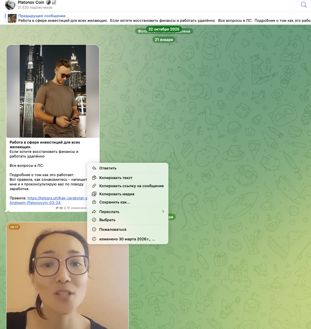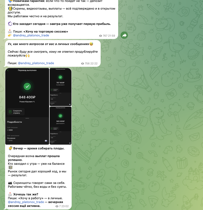 Platonov Coin – сообщество в Телеграм, в котором некий трейдер Андрей Платонов рассказывает о возможности заработать на инвестициях с ним. Он предлагает высокодоходные инвестиции с гарантией прибыли. По его рассказам внесенную человеком сунну он сможет увеличить в 100 раз. Уже этого вполне достаточно, чтобы понять, что перед нами типичная раскрутка счета. Андрей Платонов в Тг отзывы не собрал, поэтому мы расскажем подробнее о его работе.