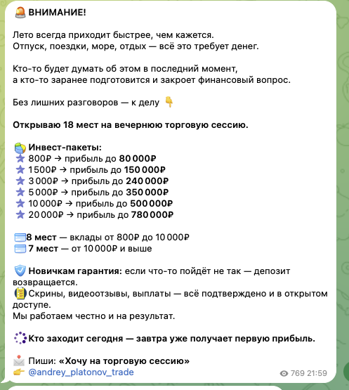 Автор рассказывает о том, что зарабатывает на трейдинге огромные деньги. Он говорит о том, что предлагает всем желающим воспользоваться его услугами и инвестировать в трейдинг. Всего из 800 рублей он обещает сделать 80 тысяч всего за 1 торговую сессию.