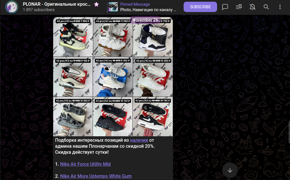 На телеграм-канале PlonarMarketDiscount пользователи могут купить оригинальные кроссовки и часы. Менеджеры регулярно обновляют ассортимент и предлагают широкую размерную сетку. В последней публикации за 26 ноября 2025 год команда представила партию кроссовок NIKE, Addias.