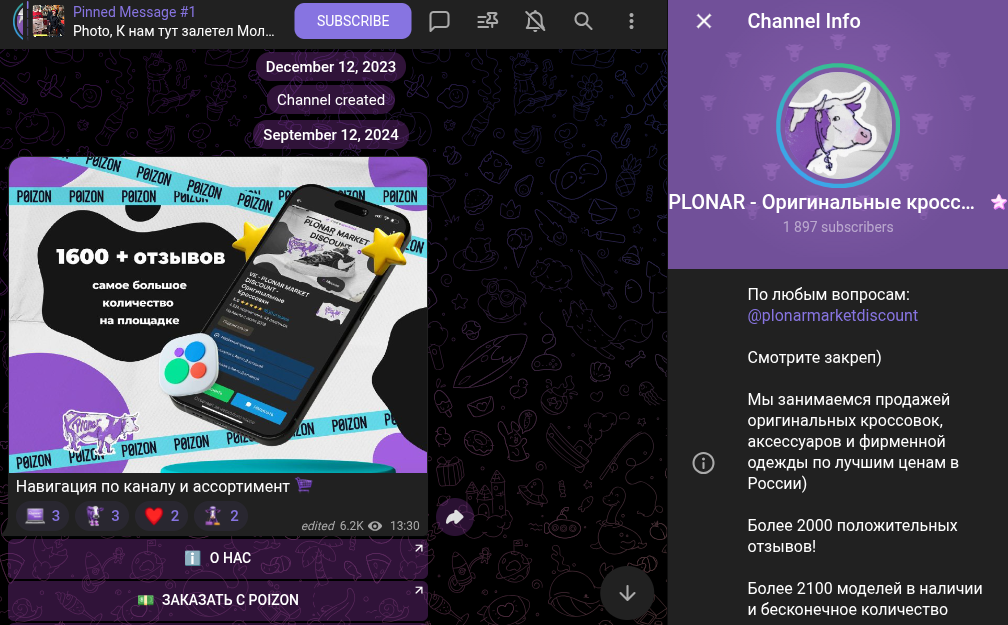 Plonar Market — интернет-магазин якобы оригинальных кроссовок и часов по существенным скидкам. Команда марктеплейса в телеграме отмечает, что каждое устройство проверено и имеет всю необходимую сертификацию, подтверждающую техническое состояние. Кроме того, менеджеры сообщают, что для постоянных клиентов и крупных заказчиков действуют индивидуальные условия. Неизвестно, действительно ли у магазина есть покупатели. Ведь статистику сделок создатели не демонстрируют.