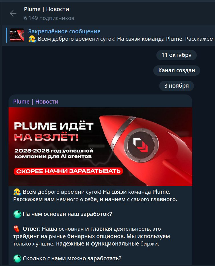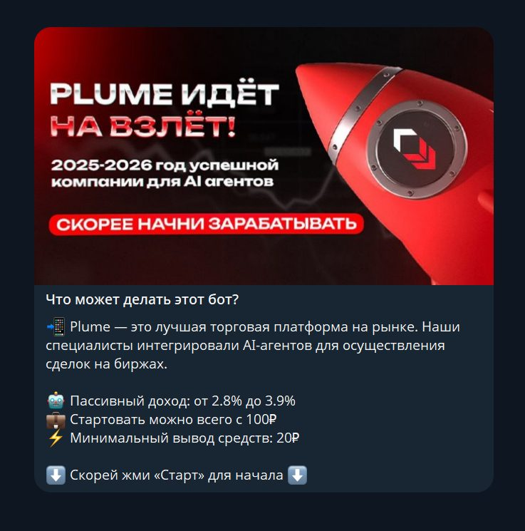 Признаков реальной инвестиционной деятельности у Plume Банк в Телеграме нет: отсутствие статистики торгов, анонимность владельцев, агрессивная реклама через клонов и постоянные изменения условий работы указывают на типичную модель финансовой пирамиды.