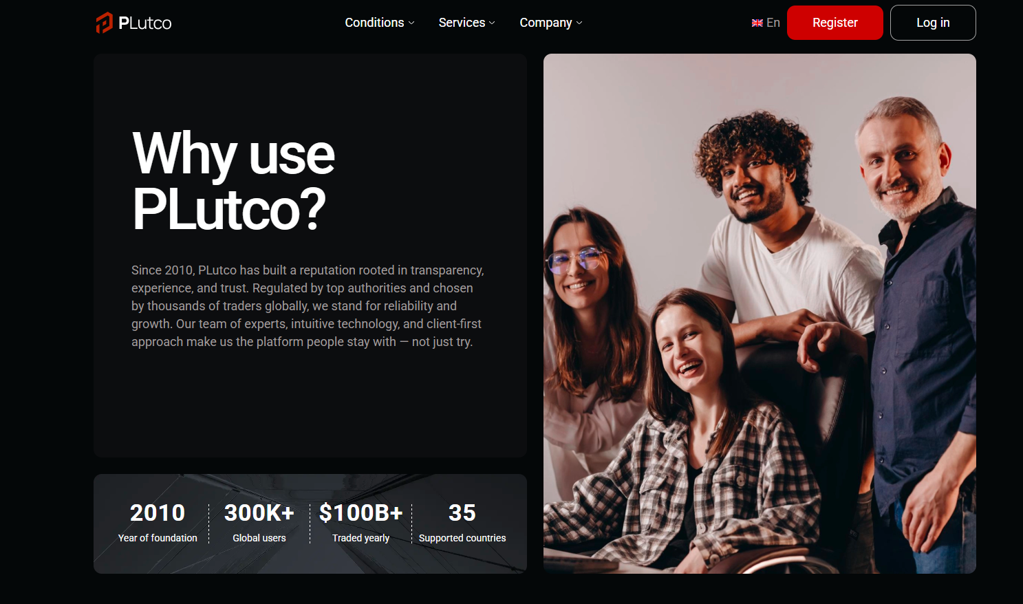 Plutco Com подает себя как современную CFD-платформу, работающую на рынке с 2010 года, с 300К пользователей, $100B+ оборота в год, 35 странами, удобной панелью и тремя уровнями счетов.