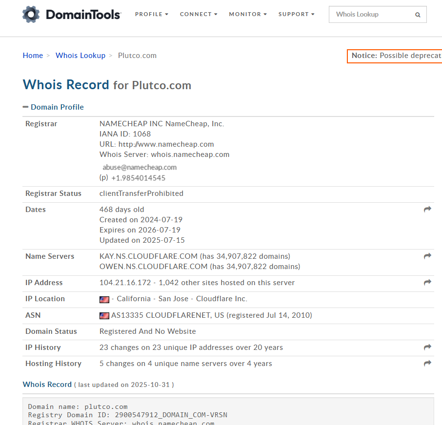 Домен сервиса live plutco молодой: дата регистрации 19 июля 2024 года (история про 2010 г. не правда), хостинг через Cloudflare, WHOIS закрыт приватностью, юрадрес в шаблонах Oceania Business Plaza, Панама.