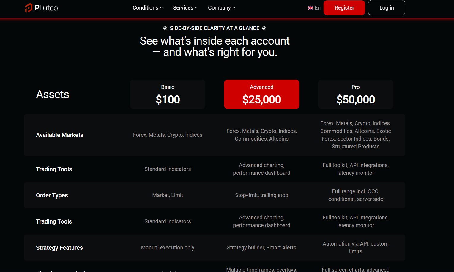 Тарифная сетка выглядит просто. “Базовый” от $100 с низким порогом. “Расширенный” уже $25К, и “Профессиональный” от $50К с обещаниями API, коллокации, raw execution, OCO-приказов и кастомных лимитов. Такой разлет нужен, чтобы после успешного теста маленькой суммы подвести к дофинансированию на весомые суммы.
