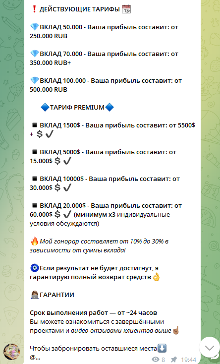 Хотя неизвестно, кто в действительности стоит за данными сообществами, высока вероятность того, что видео и фотографии админа были просто куплены на бирже фриланса. Тем не менее схема работы, которая предлагается – является крайне распространенной. Автор не только пытается похитить сумму инвестиций, а ведь она достаточно большая. Когда пользователь вносит средства, с него пытаются тянуть дополнительные вклады. Рассказывают о том, что нужно оплатить комиссию биржи, уплатить налоги, услуги гаранта и т.д. В итоге сумма, которую требуют с него может доходить почти до той, которую якобы должны выплатить.