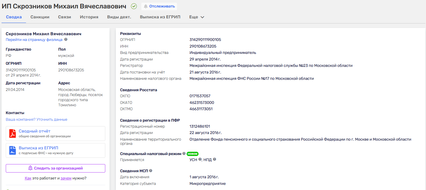 Сайт принадлежит ИП Скрозникову Михаилу Вячеславовичу. Налоговый статус он получил в августе 2016 года.