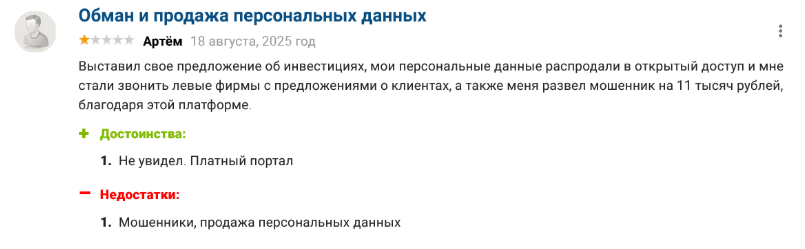 В Интернете при этом есть и негативные отзывы о сайте PoiskInvestorov ru. Артем пишет, что столкнулся с продажей своих персональных данных и обманом со стороны администрации.