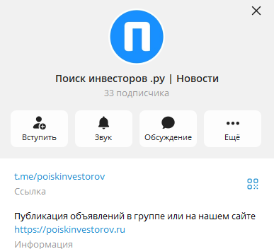 На телеграмм-канал «Поиск инвесторов ру | Новости» к началу декабря 2025 года подписано 33 пользователя. Комментарии под постами открыты, но аудитория не проявляет активность.