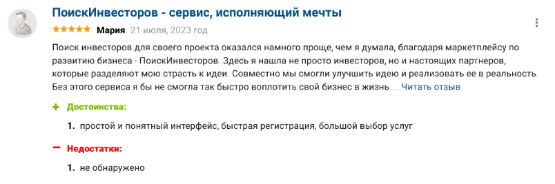 В открытых источниках удалось найти положительные отклики от пользователей, которым понравился функционал сервиса. Мария пишет, что ей довольно легко удалось привлечь инвесторов в своей проект, совместно удалось улучшить начальную идею.