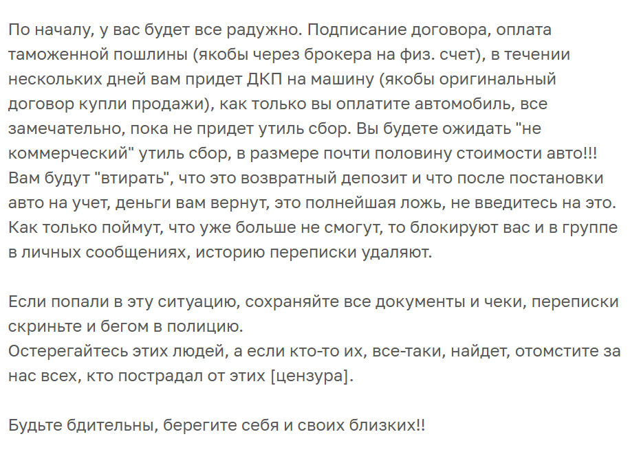 На предоплате и утильсборе команда телеграм-канала «Покупаем в Европе» не останавливается. Далее идет еще ряд выдуманных услуг вплоть до полного обнуления банковского счета доверчивого покупателя.