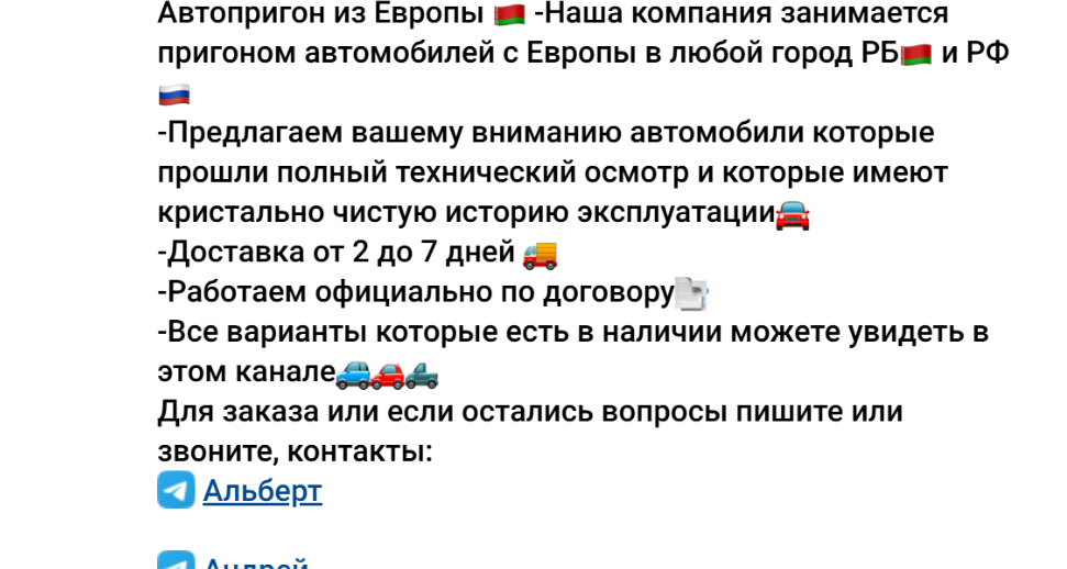 В отзыве о телеграм-канале «Покупаем в Европе» хотим сказать, что перед вами типичная площадка на базе ТГ паблика, где менеджер Albert Rb Avto и manager 4ndrey предлагают автомобили. Стоит отметить, концепция с транспортными средствами лишь только набирает обороты, учитывая проблемы с поставкой зарубежных машин. Однако, большая часть рассмотренных нами пабликов — полнейший развод, который не стоит ни капли вашего внимания.