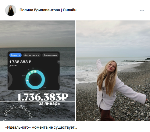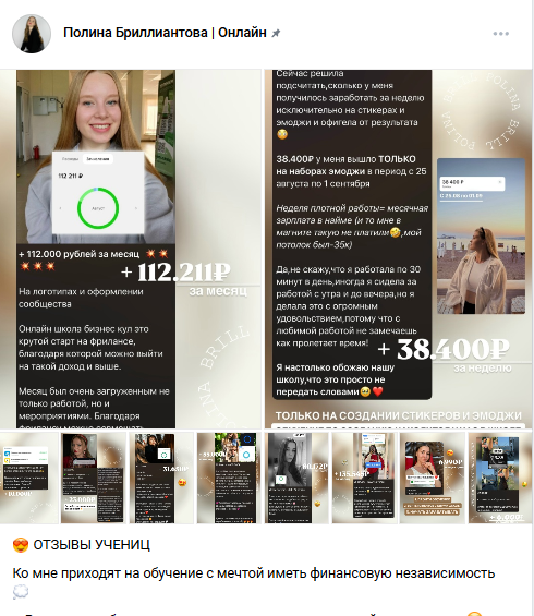 В своих социальных сетях Бриллиантова Полина Евгеньевна регулярно рассказывает истории о высоком доходе своих учениц без опыта. Наставница утверждает, что сама зарабатывает свыше полутора миллионов рублей в месяц, работая всего по паре часов в день из любой точки мира.