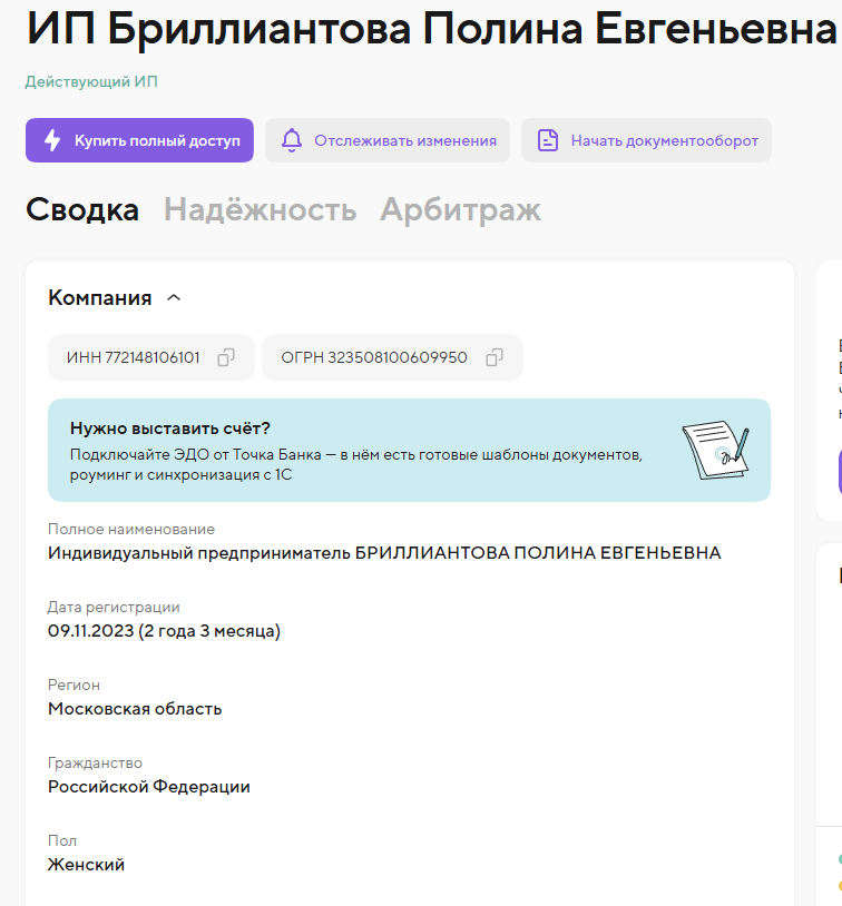 Основательница заявляет о легальной работе и использует реквизиты ИП Бриллиантова Полина Евгеньевна с датой регистрации от 9 ноября 2023 года, но нет официальных документов и публичной оферты для сверки этих данных.
