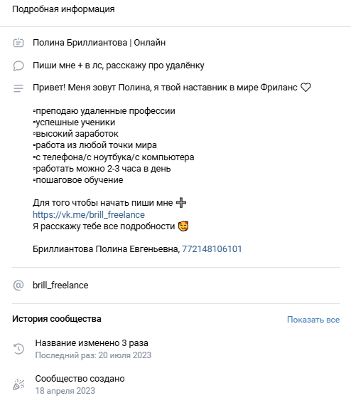 Очередная мошенническая схема под видом «школы» от Полины Бриллиантовой! Обещания заработка от 100 000 рублей в месяц на простых заданиях — это просто ловушка для доверчивых людей. Группа во ВКонтакте с накрученными подписчиками и отсутствием реальной активности только подтверждает фальшивость проекта. Отсутствие официальных документов и публичной оферты делает невозможным защиту своих прав в случае обмана. Не дайте себя обмануть этим аферистам!