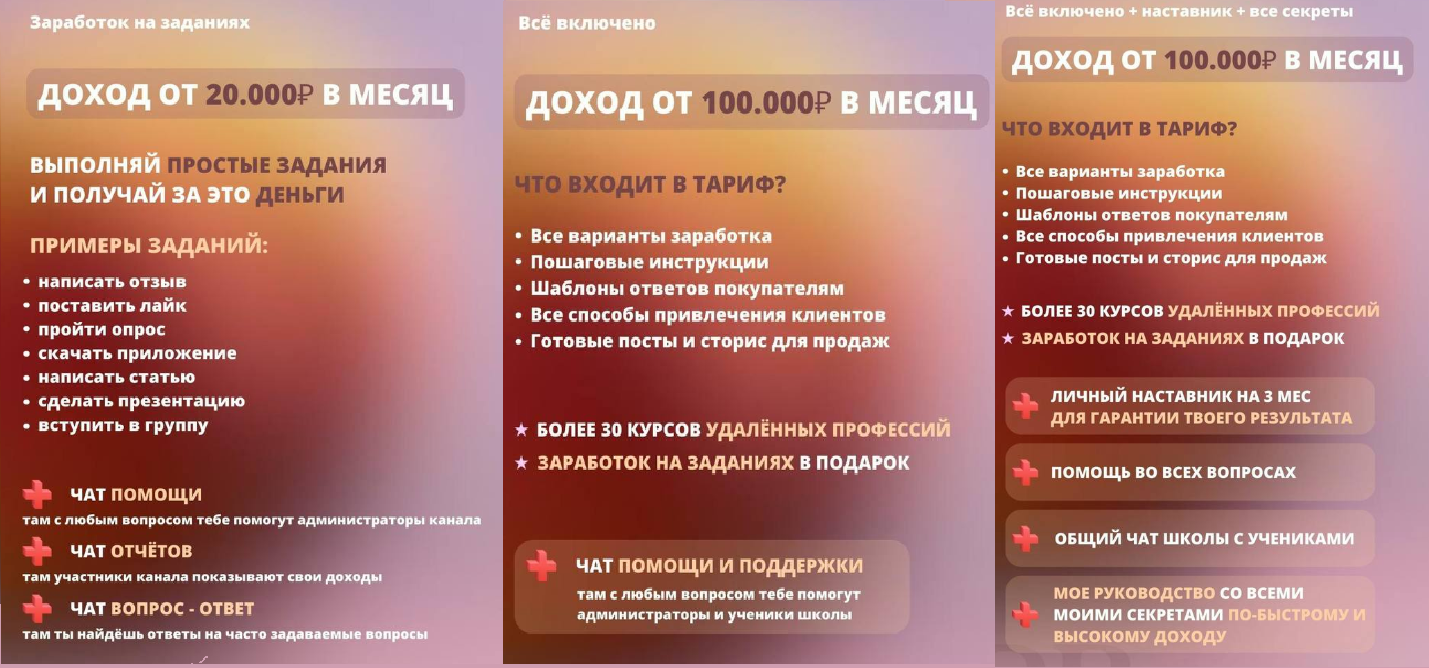 - первый тариф обещает заработок от ₽20,000 в месяц на выполнении элементарных заданий в интернете вроде простановки лайков и скачивания мобильных приложений;