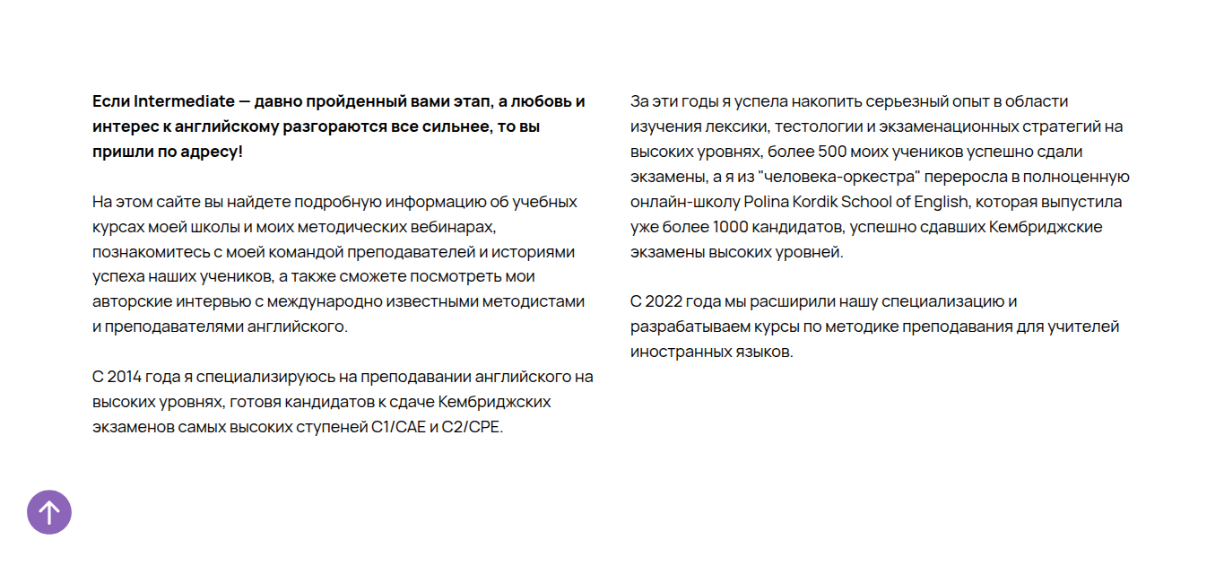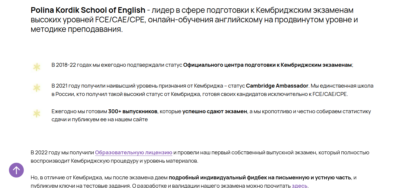 В лонгриде на сайте лектор заявил, что с 2022 года расширил специализацию. Теперь академия обучает студентов тому, как правильно преподавать иностранные языки, чтобы соответствовать нормам международного образования. Там же на сайте есть очередное маркетинговое утверждение про то, что онлайн-школа Полины Кордик School of English — лидер в сфере обучения продвинутому английскому с акцентом на FCE/CAE/CPE.