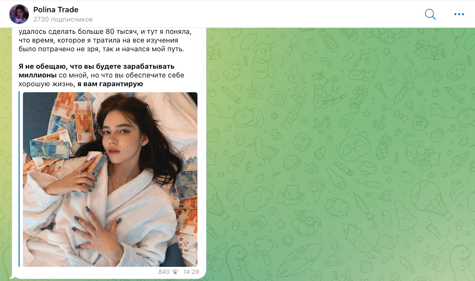 Владельцем проекта о трейдинге является некая Полина (Polina Trade). Личных данных, историю успеха в торговле девушка не раскрывает целевой аудитории. Голословно мошенница не просто обещает, а гарантирует своим клиентам обеспечить хорошую жизнь. Ссылки на личный инвестиционный портфель, торговую лицензию, договор с брокером могли бы стать более весомыми гарантиями для потенциальных инвесторов. Так же все написанное автором канала напоминает банальный развод.