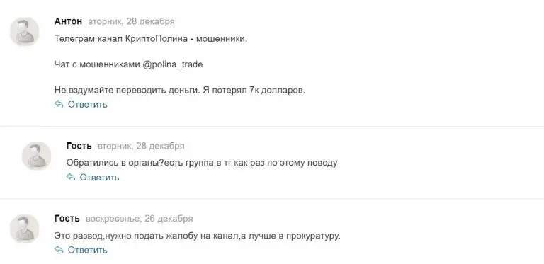 Все найденные о телеграм-канале и его владелице комментарии в интернете только негативные. Отрицательные отзывы содержат обвинения в мошенничестве и жалобы на утрату достаточно больших сумм.