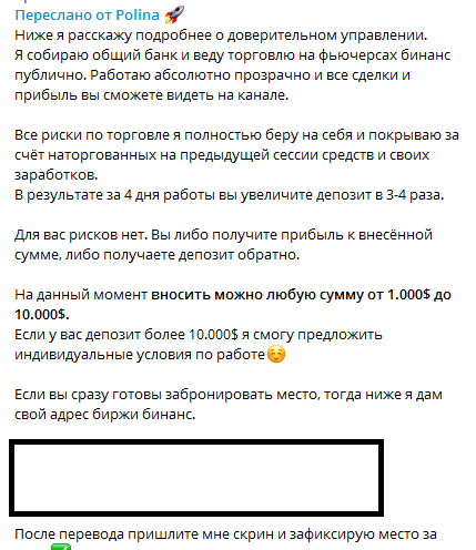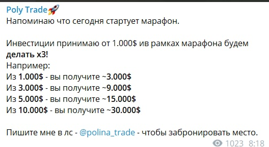 Упомянутые выше суммы подписчик якобы может заработать за 4 дня. Чтобы получить столь высокую прибыль, достаточно забронировать место у Polina Trade. Все риски, связанные с будущей торговлей, «гуру» трейдинга берет на себя. Администратор канала гарантирует всем участникам марафона своевременную выплату прибыли. Только вот эти гарантии ничем официально не подкреплены.