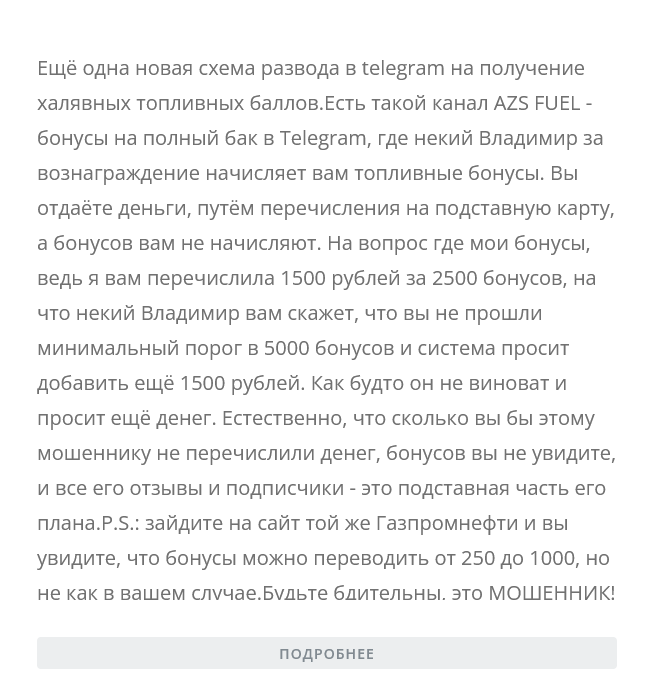 - Об авторе сообщества данных не было, неизвестно, где админ канала в Тг «Полный бак» брал карты с топливными баллами. Скорее всего, никаких бонусов не было, Владимир просто разводил людей на деньги.