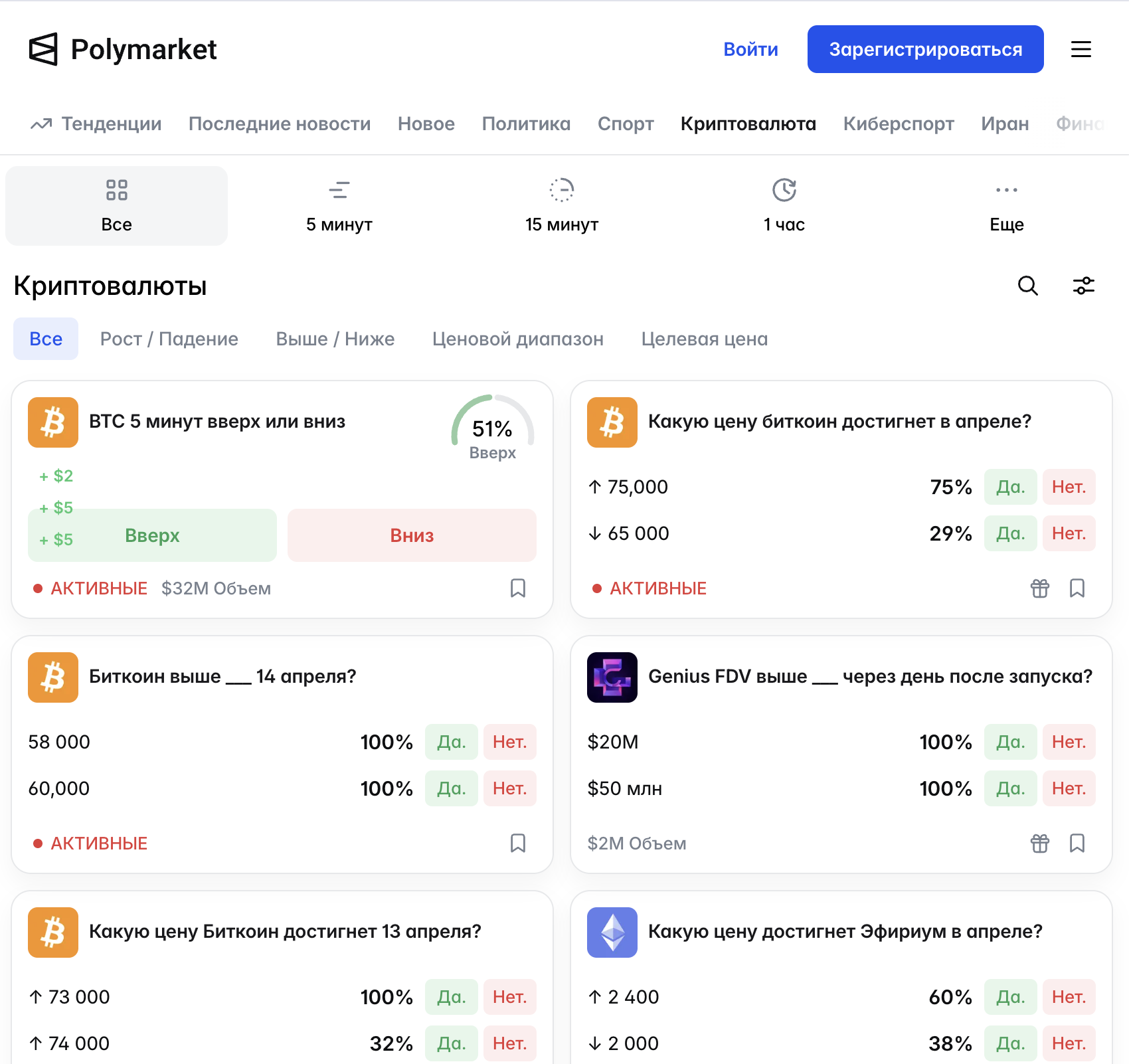 Polymarket является фактически родоначальником нарратива рынков предсказаний, не имея аналогов в России. Платформа позволяет людям ставить деньги на свое мнение и зарабатывать на разных событиях в мире. Вся логика работы строится вокруг контрактов на исход событий, где трейдер покупает “да” или “нет” по определенной цене. Цена колеблется от 0 до 1 доллара и показывает вероятность исхода, на которой и строится заработок на полимаркете.