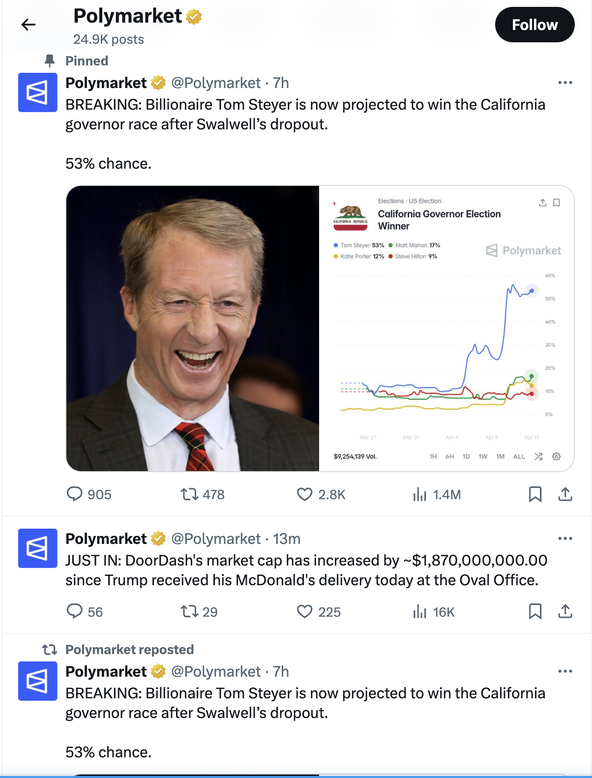 При обзоре медиа Polymarket можно видеть много отличий от традиционных беттинговых контор с которыми часто сравнивают платформу. В X (Twitter) можно найти много срочных новостей или инсайтов, которые возникают на игре вероятности. Например, сообщения о быстрорастущей вероятности ядерной войны, или цитаты крупных медиаперсон.