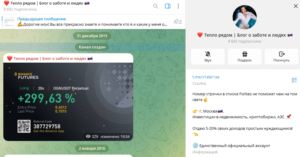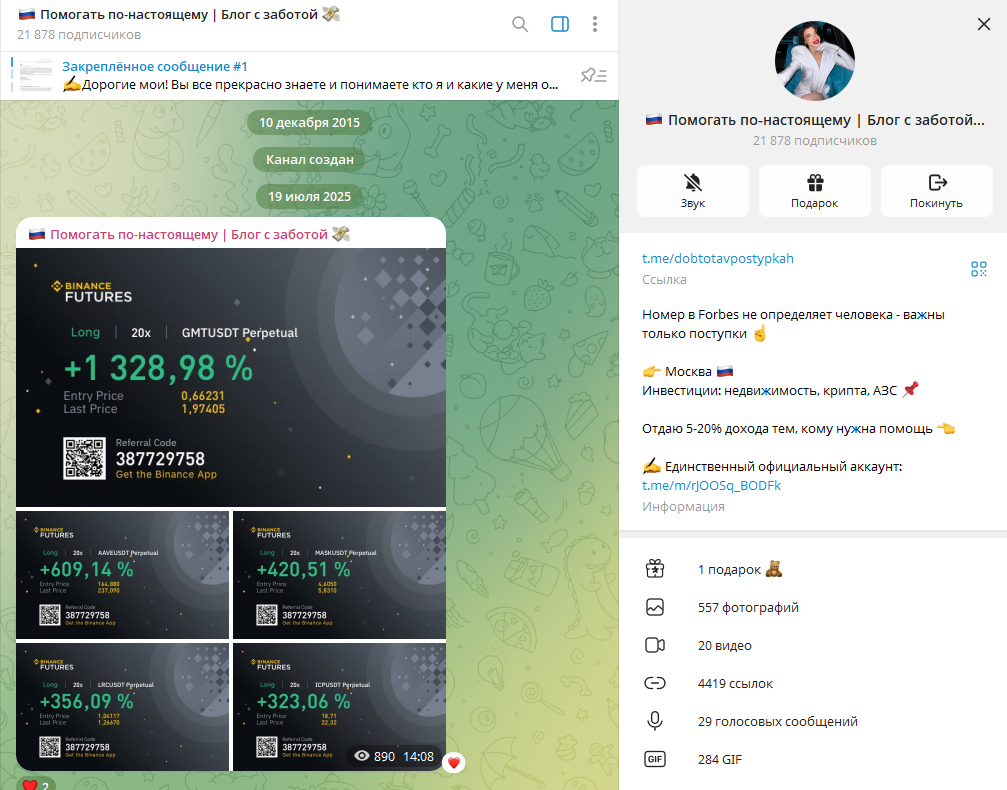 Девушка предлагает пользователям раздачу денег. Как заявляет сама трейдерша, делится со всеми желающими капиталами она просто так, из душевных порывов. Каждый день она разыгрывает сотни тысяч рублей, по нескольку раз в день. Крайне сомнительно, что некая неизвестная миллиардерша не просто раздает огромные деньги незнакомцам, но и еще и находит время вести сообщество в Тг.
