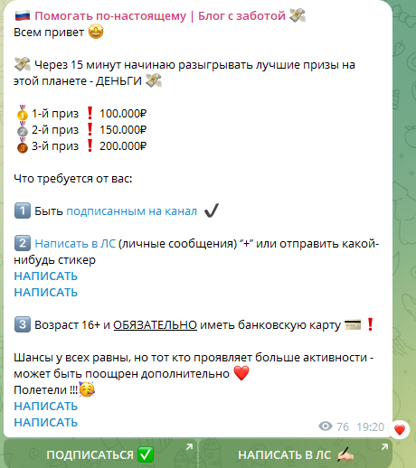 Очередной «благотворительный» проект, обещающий раздачу крупных сумм за простую подписку, на деле оказывается банальной ловушкой для доверчивых людей. Обещания подарить 100-200 тысяч рублей без каких-либо усилий выглядят смехотворно и рассчитаны на наивных пользователей. Отсутствие прозрачности, фейковые отзывы и накрученные подписчики лишь подтверждают мошенническую природу канала. Сколько еще людей должно обжечься на таких аферах, чтобы наконец понять: бесплатный сыр бывает только в мышеловке. Неужели так сложно проверить информацию, прежде чем слепо доверять свои деньги и время мошенникам? Пора уже научиться на чужих ошибках и перестать быть наивными жертвами подобных схем.