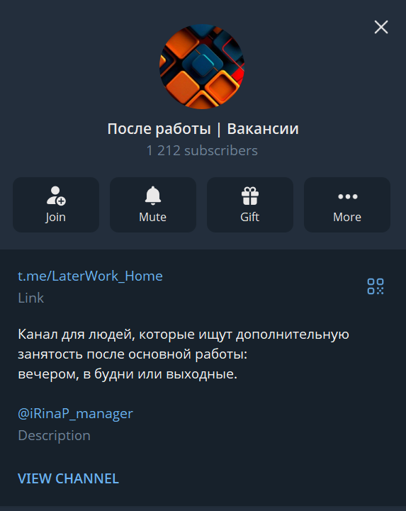 Обзор контактных данных канала в Телеграме «После работы вакансии»