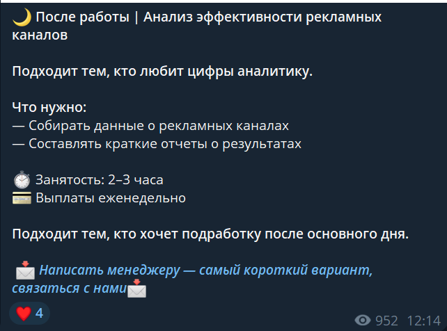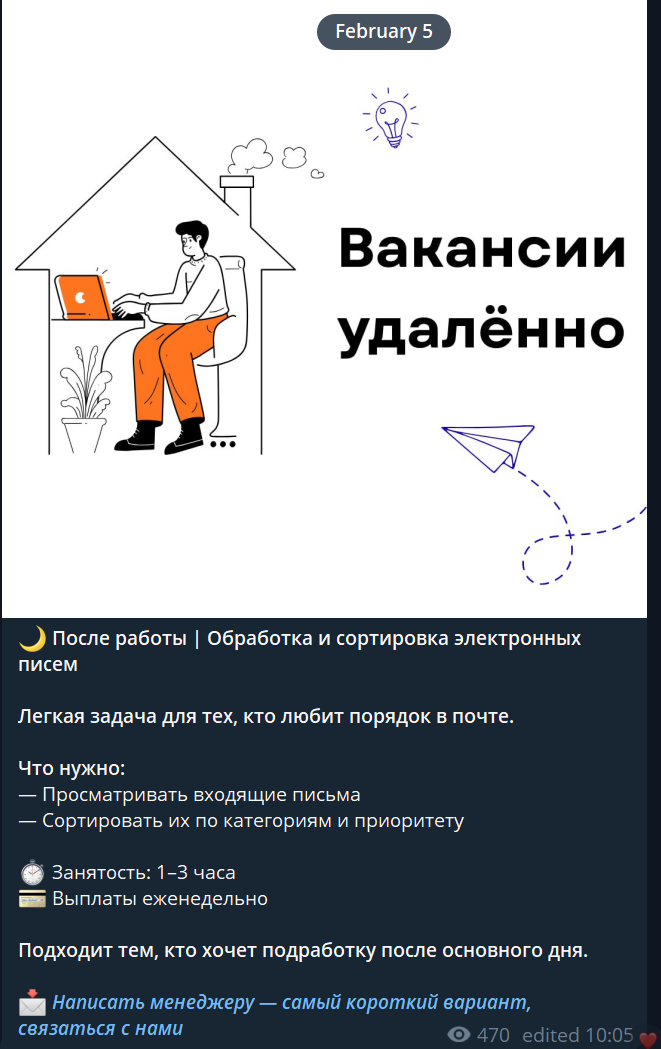 «После работы вакансии» публикует сообщения о вакансиях для дополнительной занятости. Описываются простые задачи, такие как обработка электронных писем или ввод данных в системы, которые делаются за пару часов. Каждое сообщение содержит информацию о занятости, выплатах и просьбой написать менеджеру.