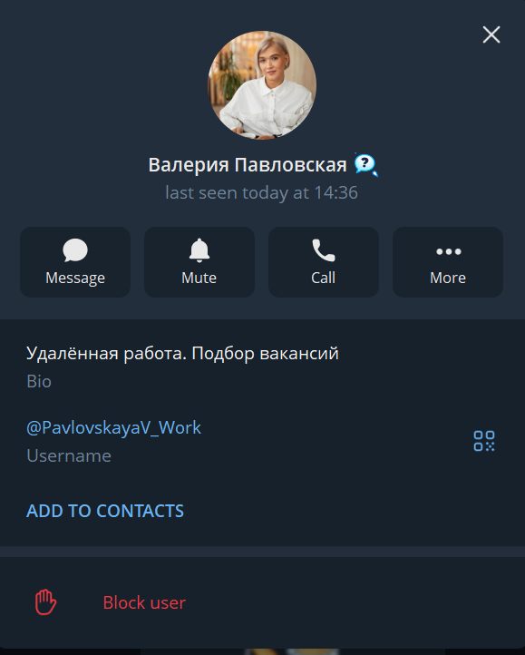 Контактные данные ограничены одним Telegram-аккаунтом. Основным контактом выступает профиль PavlovskayaV Work. Других данных, таких как электронная почта, номер или сайт, не публикуется. Канал начал свою деятельность в феврале 2026 года.