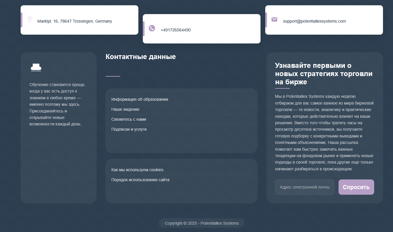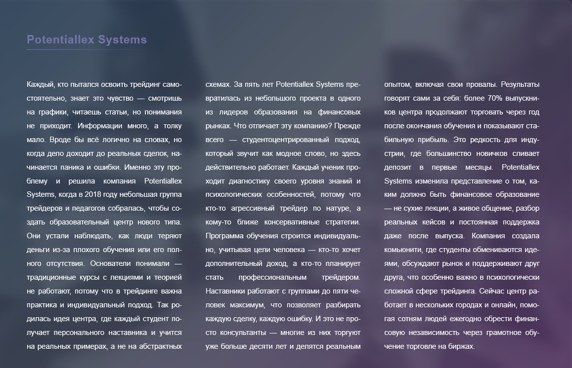 Potentiallex Systems – образовательная платформа, на которой пользователям предлагаются уроки трейдинга. По легенде проекта, он был создан в 2018 году командой экспертов из Германии. Однако есть основания полагать, что платформа может быть создана для обмана. Подтверждения представлены в обзоре.