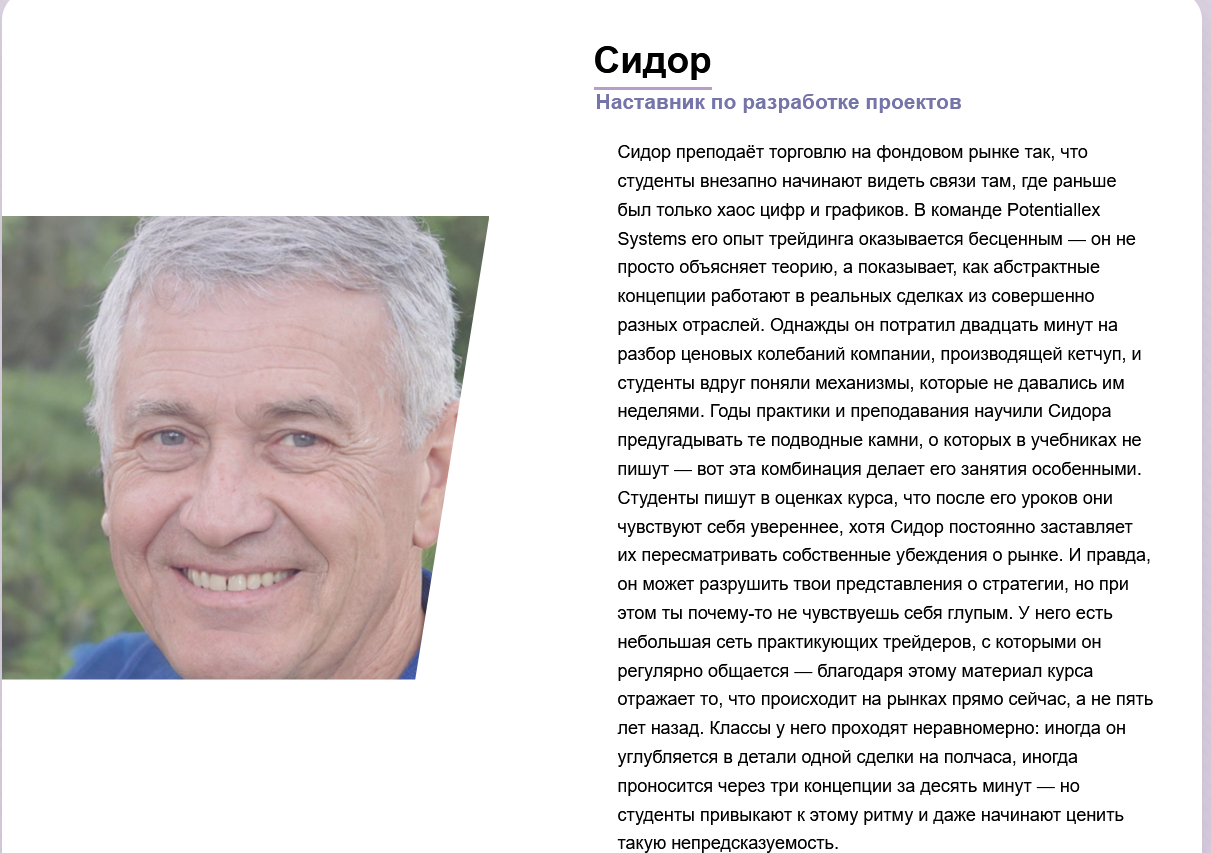 На сайте нет нормальных сведений о создателях. Вместо этого есть статья о некоем наставнике по разработке проектов Сидоре. При этом фото эксперта может быть сгенерированным, а другой информации о нем нет. Что за трейдер Сидор преподает в германской онлайн-школе – неясно. Эксперту даже не удосужились придумать фамилию.
