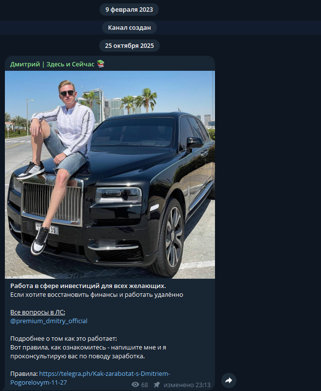 Дмитрий Погорелов создал канал 9 февраля 2023 года. Первый пост появился 25 октября 2025 года. Это типичная схема мошенников. Накрутить аудиторию, закупить рекламу, прокрутить одну схему и закрыть проект. Через 1-2 года повторить.