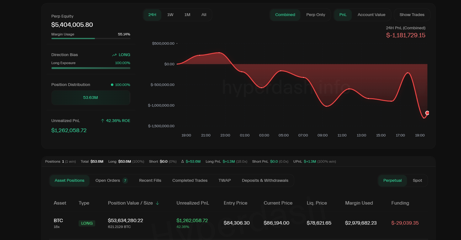 Так среди последних крупных событий, команда канала выложила информацию о пользователе с кошельком 0x7d16…, который спустя 18 месяцев инактива зарядил LONG позицию на целых 370 BTC (~$31 000 000) и кредитным плечом 20X. Это означает, что в случае достижения позиции $78 970 за BTC (ордер был создан при цене $83 850) его ждет ликвидация и потеря крупной суммы средств.