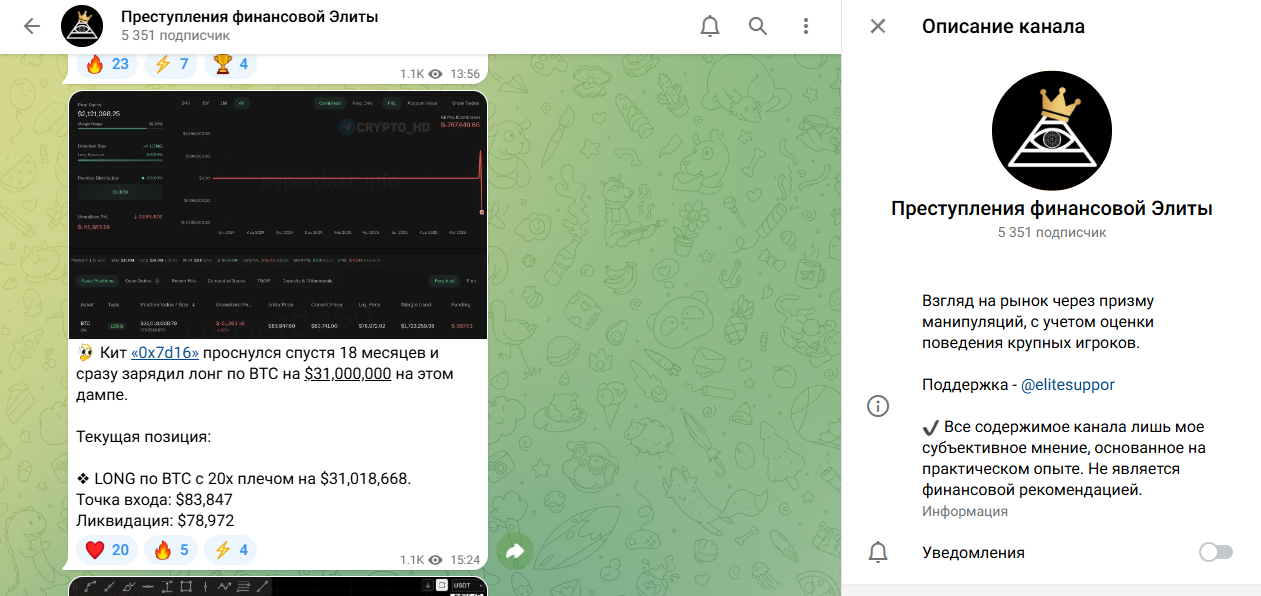 Телеграм канал Преступление Финансовой Элиты позиционирует себя как ресурс для анализа рынка с учетом действия крупных игроков — китов. При этом большая часть контента это сухой ТА, где лишь иногда появляется информация о позициях держателей крупной суммы крипты. В целом на тгк подписано более 5500 человек, но охваты едва превышают 20%, из-за чего владельцы наверняка использовали накрутку ботов для привлечения внимания к ресурсу.