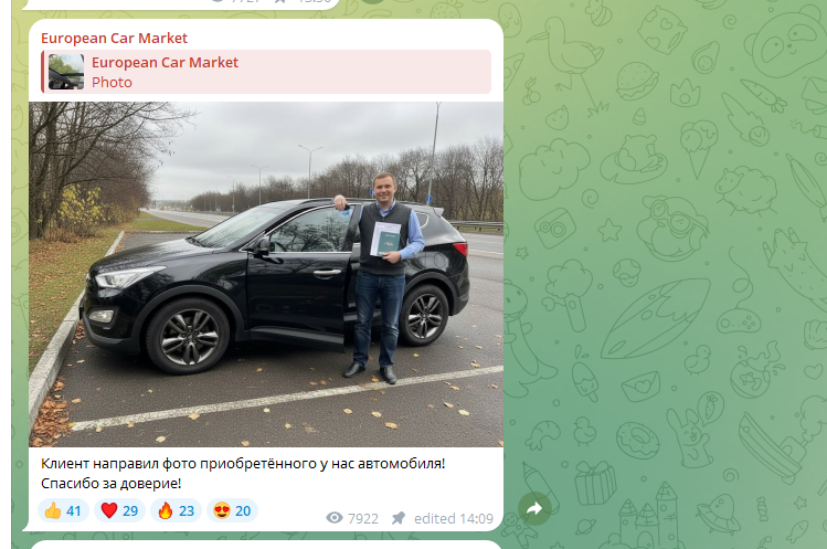 На самом канале European Car Market комментарии под постами закрыты. Обратную связь контролирует админ: время от времени он сам выкладывает отзывы “довольных клиентов”. Их немало, и все они включают фото или видео от покупателя с успешно приобретенной машиной.